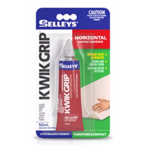 Selleys Kwik Grip® Horizontal is a heat resistant, solvent-based, flexible contact adhesive for broad close fitting surfaces. It forms an instant bond on contact of two surfaces.
