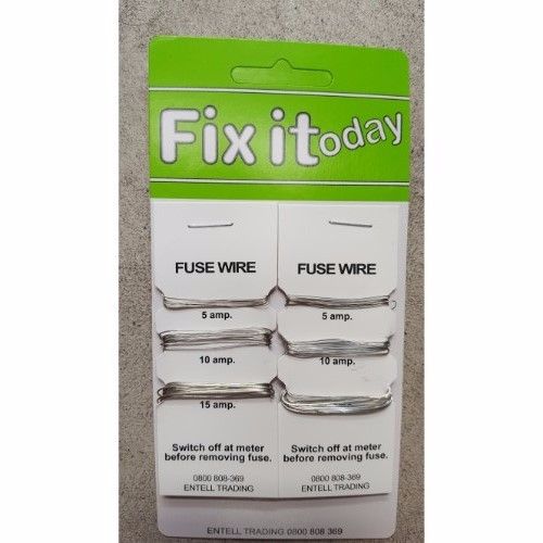 Household pack of fuse wires that includes one metre each of 5 amp, 10 amp and 15 amp versions.