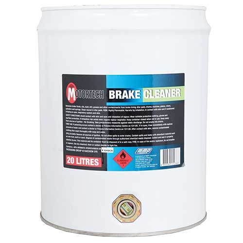 Motortech Brake Cleaner (20L): for the removal of brake fluid, oil, and other contaminants from brake drums, linings, pads cylinders, and springs. Can be applied without disassembly of brakes.