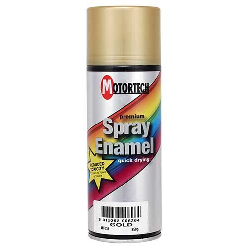 (GOLD) Suitable for both interior and exterior use on cupboards, doors, gates, wrought iron, screens, trelises or anywhere requiring a high gloss finish, Motortech Enamel Spray Paint is a quick drying paint perfect for the home or workshop.
