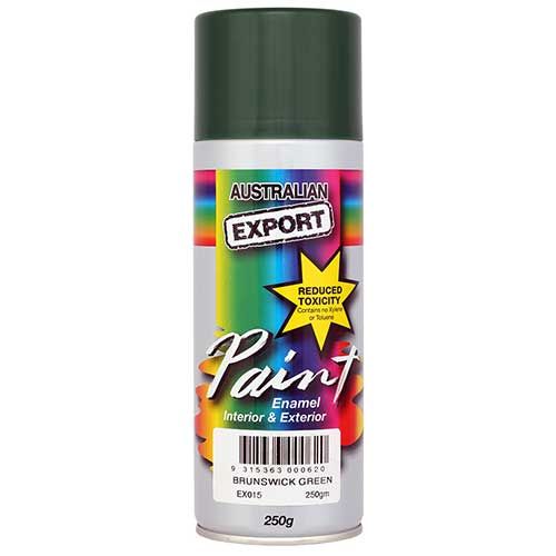 (BRUNSWICK GREEN) Looking to add some colour to your next project? Australian Export's range of enamel spray paints are perfect for general paint applications around the home. Their adjustable fan spray nozzles make them super easy to apply allowing them to be used on a range of different applications. Export paints are fast drying and available in gloss, metallic and primer.