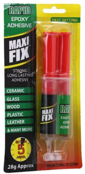 Strong long lasting adhesive. Dispenses equal quantity or resin & hardener with one push. 5 minute fast set time allows for rapid binding. Sticks ceramic, glass, wood, plastic and many more. Ideal for household repairs and handy craft.